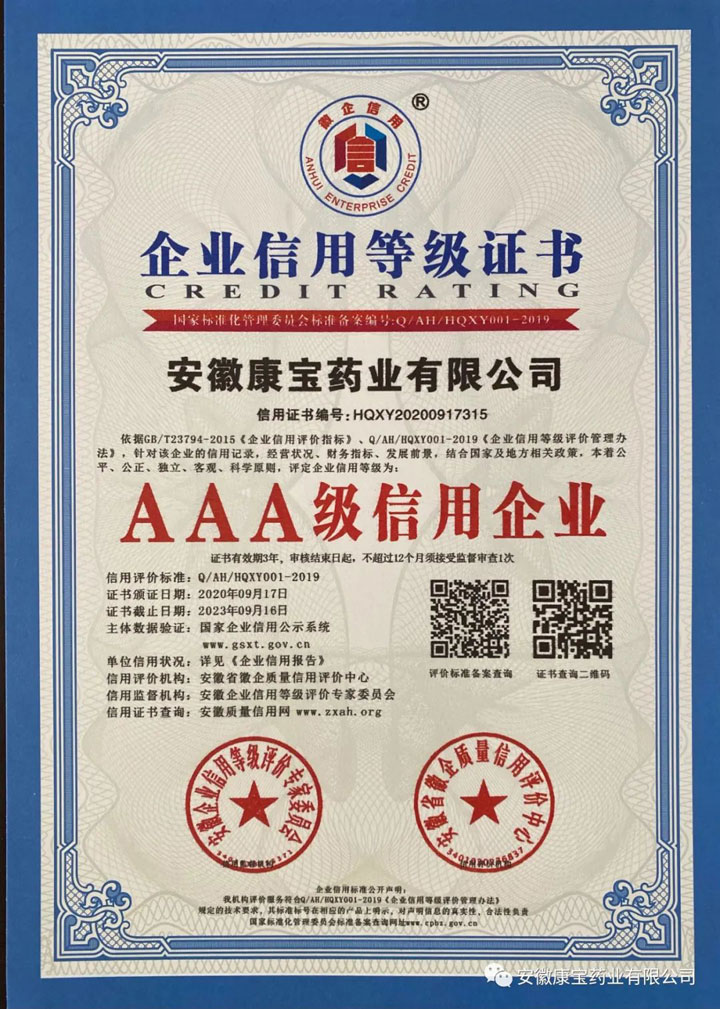 近日,安徽企業(yè)信用等級(jí)評(píng)價(jià)專(zhuān)家委員會(huì)公布了2020年“AAA級(jí)信用企業(yè)”評(píng)選結(jié)果,安徽康寶藥業(yè)有限公司喜獲“AAA級(jí)信用企業(yè)”榮譽(yù)稱(chēng)號(hào),為最高信用等級(jí)。